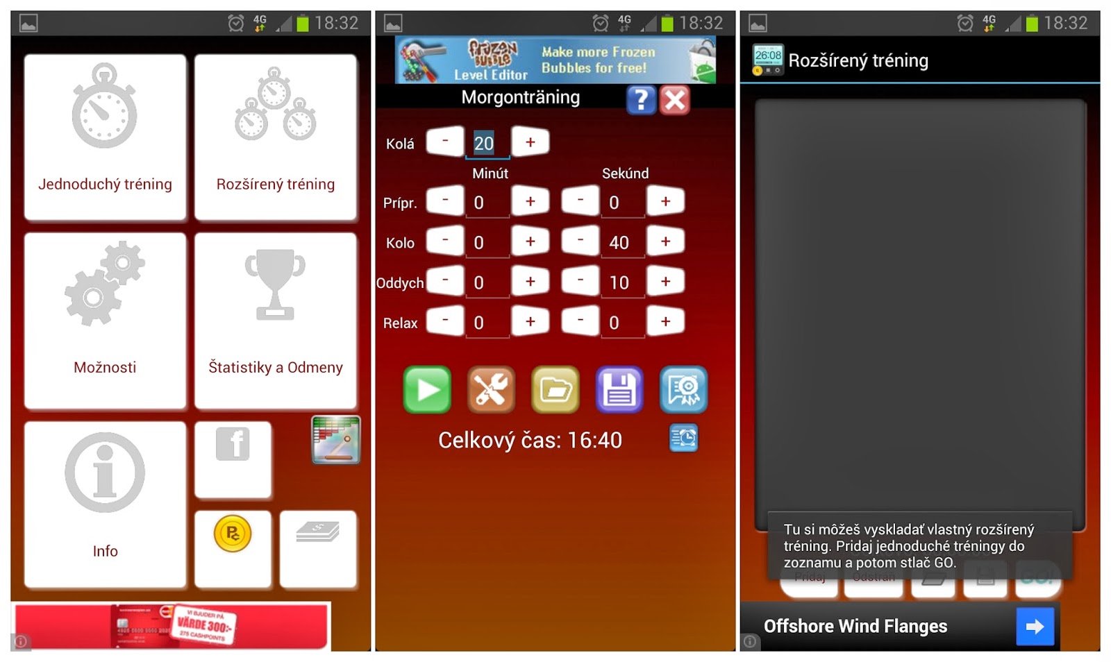 Možnost číslo dvě jsem si vybrala já a tím pádem začala honba za perfektní intervalovou aplikací. V Google Play jich najdete několik. Vyzkoušela jsem tři a nejvíc jsem si oblíbila Interval Timer AD. Je bezplatný, i když si samozřejmě můžete koupit i placenou verzi. Protože zatím není přeložený do češtiny (což mně nevadí, ale co vy čtenáři, kteří si chcete udělat obrázek?), uvažovala jsem, jestli jsem screenshoty dát ve švédštině (ale to byste mi asi nepoděkovali) nebo v angličtině. Nakonec jsem teda naťukala slovenštinu - ta je srozumitelná stejně jako čeština. Jazyk aplikace se ale instaluje podle automatického jazykového nastavení telefonu (jazyk aplikace = jazyk mobilu).